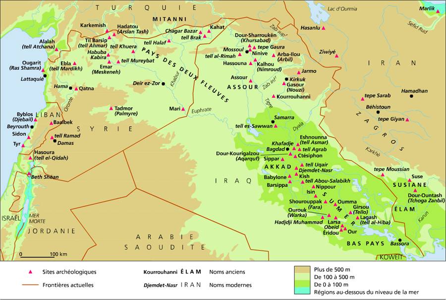 Vaste région de 375 000 km2, qui comprend toutes les terres basses des bassins de l'Euphrate et du Tigre, et correspond en gros aux pays actuels de l'Iraq et du nord-est de la république de Syrie, la Mésopotamie est le plus ancien et, du VIe au Ier millénaire avant J.-C., le plus important des foyers de la civilisation.