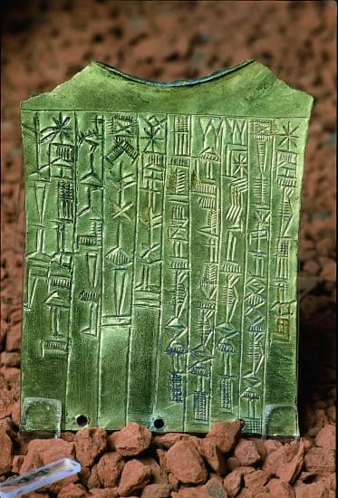 Cette grande unité économique, qui comporte champs, troupeaux, ateliers, greniers et magasins, n'englobe ni toute la terre de la cité ni toute sa main-d'œuvre, mais elle est la seule à avoir laissé des traces : c'est pour ses comptes et ses contrôles que l'on invente la première de toutes les écritures et le sceau de forme cylindrique qui, mieux que le cachet plat, couvre le tampon d'argile des portes et des récipients d'une empreinte continue qui en garantit l'intégrité. Attesté à Ourouk dès 3400 avant J.-C. environ, ce système graphique, qui est l'ancêtre de l'écriture cunéiforme, emploie dès avant 3000 avant J.-C. les signes phonétiques qui permettent d'y lire du sumérien.