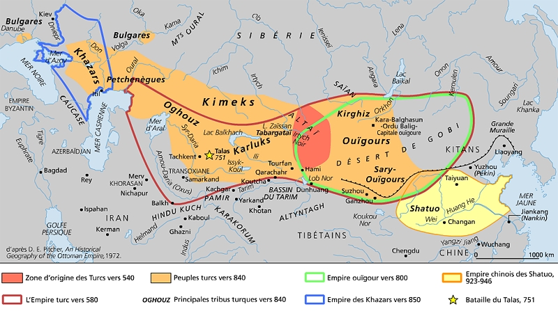 On emploie en général le terme de « ProtoTurcs » pour désigner plusieurs confédérations nomades qui se sont formées en haute Asie (Xiongnu, Tabghatchs ou Tuoba) avant la formation de l'empire des Tujue (vie-viiie s.). Cet empire immense, qui s'étendait jusqu'aux frontières de la Perse sassanide, est divisé entre les Tujue occidentaux et les Tujue orientaux. Ces derniers sont éliminés par les Ouïgours, alliés à la Chine des Tang. À cette époque, divers peuples turcs gagnent le Sud-Est européen : les Bulgares, les Khazars, les Petchenègues, les Coumans, ou Kiptchaks. La conquête arabe porte l'islam jusqu'en Asie centrale et jusqu'au Fergana, après la victoire du Talas (751). Les Abbassides font des achats massifs d'esclaves et de mercenaires turcs (mamelouks), qui joueront un rôle de plus en plus important dans le monde musulman (dynasties des Tulunides et des Mamelouks en Égypte, des Ghaznévides en Afghanistan et en Inde). L'émirat samanide contient, au xe s., la poussée des Turcs de la steppe – qui adoptent l'islam à son contact –, avant d'être anéanti par les Karakhanides (vers 960-vers 1140) et les Ghaznévides. Les Seldjoukides déferlent au xie s. sur l'Iran, la Mésopotamie, la Syrie et l'Anatolie, suivis par une masse de tribus turques, qui feront de l'Asie Mineure et de l'Azerbaïdjan des terres turques. La conquête mongole (xiiie s.) a solidement établi la langue et la culture turques dans les vastes domaines de la Horde d'Or (Crimée, région de la Volga, Sibérie) et du khanat de Djaghataï (futurs Turkestans russe et chinois). À l'ouest, les Ottomans ont étendu leur domination jusqu'aux portes de Vienne et aux rivages de l'Afrique du Nord (xvie s.), avant de se replier, au xxe s., sur la seule Turquie.
