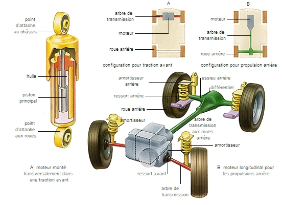 Traction avant ? Propulsion arrière ? La solution moteur à l'avant, roues avant motrices, est souvent retenue pour son confort et son habitabilité : tout l'arrière de la voiture demeure disponible pour le chargement des personnes et des bagages. La tenue de route est aussi meilleure : une voiture à traction avant est tirée par son moteur, tandis qu'une voiture à propulsion arrière est poussée. Le comportement routier de la voiture s'en ressent. La traction avant garde bien la ligne droite et se montre peu sensible aux vents latéraux, mais il faut lui imposer fermement la courbe des virages ; les tractions avant sont sous-vireuses. Les propulsions arrière, quant à elles, sont plutôt survireuses : dans un virage serré pris trop rapidement, l'arrière de la voiture a tendance à déraper vers l'extérieur de la courbe, les roues avant continuant normalement leur trajectoire.