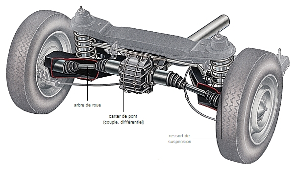 Le pont arrière comporte le couple conique, le différentiel et les demi-arbres entraînant les roues motrices. Sur les véhicules industriels, il comprend trois pièces en acier coulé ou estampé avec, au centre, le carter contenant le différentiel et, de part et d'autre du carter, un tube, ou « trompette », dans lequel tourne l'arbre de roues et sur lequel on fixe les moyeux et les ressorts de suspension.