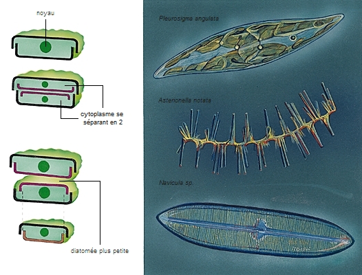 Les diatomées, dont on distingue 10 000 espèces, sont chlorophylliennes et munies d'un pigment secondaire brun. Répandues dans toutes les mers sous des formes à symétrie radiaire (centriques) et dans toutes les eaux douces, même polluées, sous des formes à symétrie bilatérale (pennées), les diatomées se multiplient de façon que chaque cellule fille emporte avec elle l'une des deux valves, puis reconstitue, emboîtée à l'intérieur de celle-ci, la valve opposée. La reproduction sexuée donne une auxospore, qui grandit rapidement avant de reconstituer des valves de dimension normale.