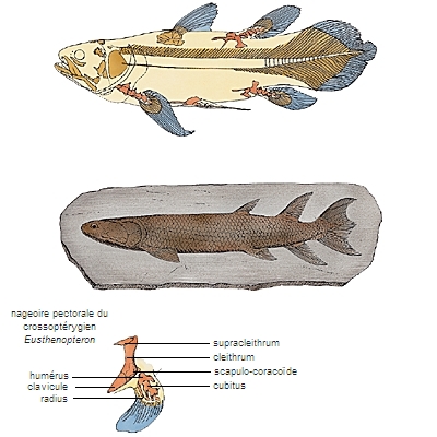 Mais le témoignage le plus remarquable du passage à la vie terrestre est la sortie des eaux des vertébrés, l'apparition des premiers vertébrés terrestres. La réussite en a été assurée par l'acquisition du membre de type tétrapode à partir des nageoires, dans le groupe des crossoptérygiens.