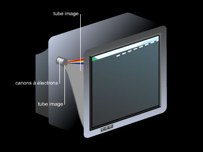 Une antenne élémentaire (doublet), permettant d'émettre des ondes, est constituée de deux tiges de gros diamètres placées bout à bout et dont la longueur totale est une demi-longueur d'onde. Le diagramme de rayonnement (répartition dans l'espace de la puissance émise) est un tore dont l'axe est parallèle à celui du doublet. Plusieurs doublets placés devant un plan réflecteur constituent un panneau directif. Plusieurs panneaux, placés sur chaque face d'un pylône, constituent l'antenne d'émission. Le retard entre les signaux appliqués à chaque panneau ainsi que leur puissance permettent de façonner le diagramme de rayonnement en fonction de la zone à couvrir. Les ondes métriques et décimétriques se propagent en ligne droite ; elles ne franchissent pas les obstacles. Les antennes d'émission sont donc placées au sommet des montagnes ou des pylônes. Ces ondes se réfléchissent sur les obstacles (montagnes, immeubles) et créent des échos sur l'image. Le récepteur sélectionne le signal radiofréquence correspondant au programme choisi. Après transposition dans une bande de fréquence plus faible (F.I., fréquence intermédiaire), les signaux image et son sont démodulés. Les signaux composites (PAL ou SECAM) sont décodés puis appliqués, avec les tops de synchronisation, au tube cathodique.