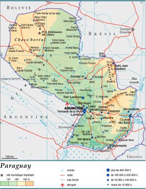 Le Paraguay est un pays au relief peu accidenté, où l'élevage bovin, l'exploitation de la forêt (acajou, quebracho), le maté, les plantations de tabac, de coton, de soja et de canne à sucre constituent les principales ressources commercialisables. La population est aujourd'hui largement métissée. L'hydroélectricité (sur le Paraná) a suscité un modeste développement industriel, mais est, en majeure partie, exportée vers le Brésil et l'Argentine. La capitale, Asunción, est la seule ville notable.