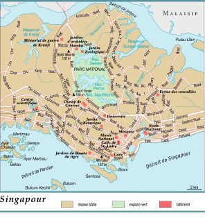 L'ancienne cité, établie au S. de l'île sur la rivière de Singapour, s'est étendue jusqu'à former une zone urbanisée couvrant 35 % de l'île. Les anciens quartiers asiatiques, complètement rasés, ont fait place à une ville moderne (grands ensembles d'habitations, quartiers industriels, comme Jurong), qui se distingue par sa propreté impeccable et son hygiène (suppression totale des moustiques). L'économie repose principalement sur le secteur tertiaire : Singapour est le centre des affaires et du commerce de l'Asie du Sud-Est, un grand centre financier, le marché des asiadollars.