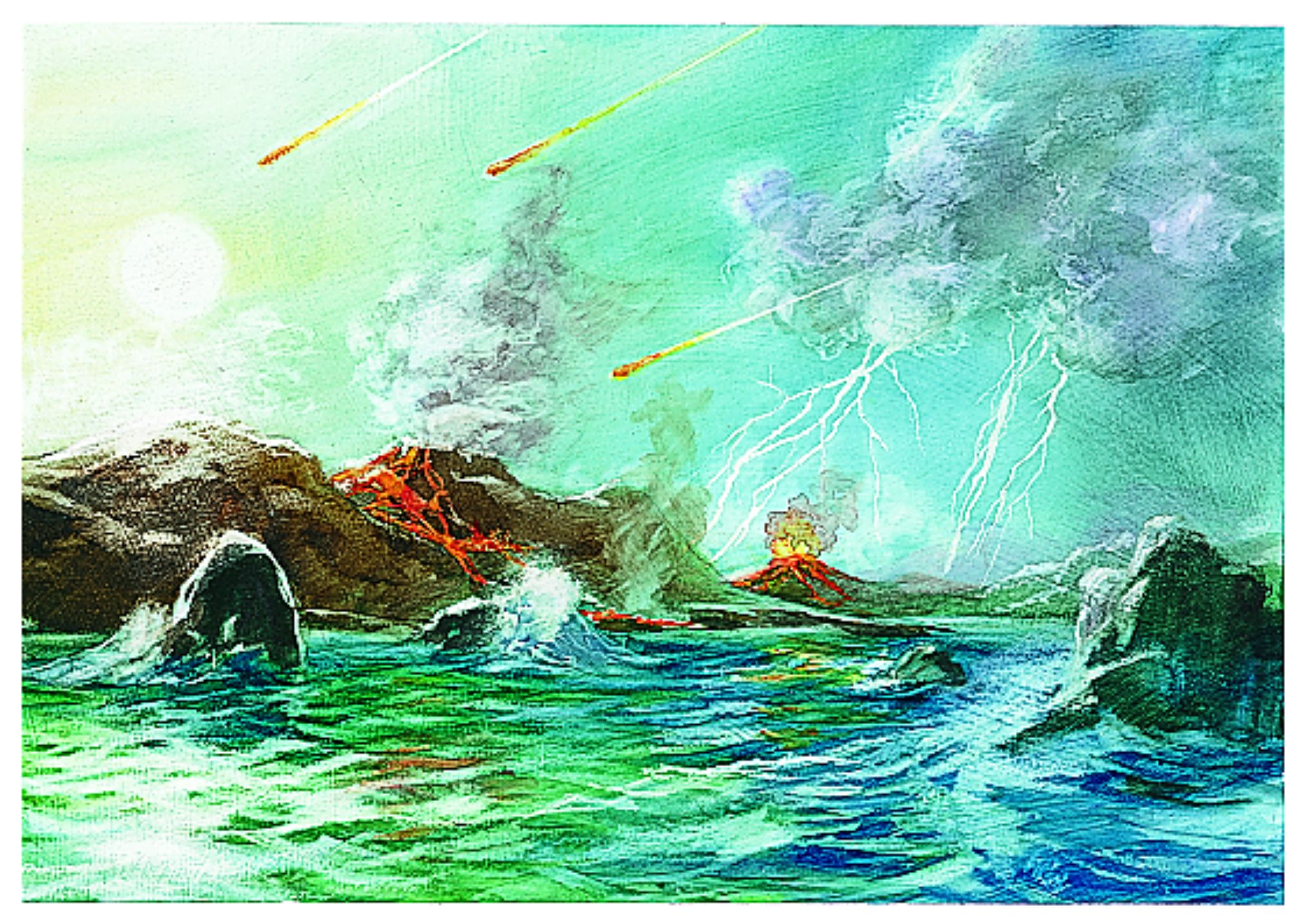 En moins de un milliard d'années, la Terre s'est constitué une atmosphère. Le refroidissement de la planète entraîne la condensation de l'eau de sa surface, produisant un milieu propice à l'apparition de la vie.