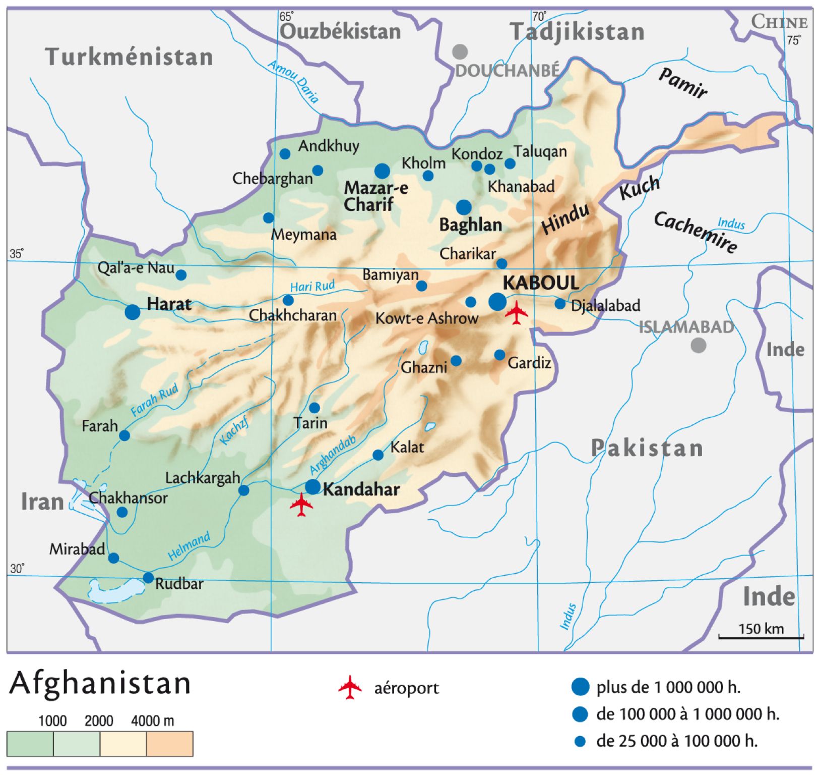 L'Afghanistan est un pays montagneux (plus de 40 % de la superficie au-dessus de 1 800 m), surtout au N.-E., occupé par l'Hindu Kuch. Des plaines descendent vers le N. jusqu'à 250-300 m, tandis qu'au S.-O. la dépression de Sistan est parcourue par le Helmand. Le climat est rude : froid en hiver, parfois torride (au S.-O.) en été, presque toujours aride. La steppe domine. Les précipitations n'arrosent que l'Hindu Kuch et les chaînes du Sud-Est.