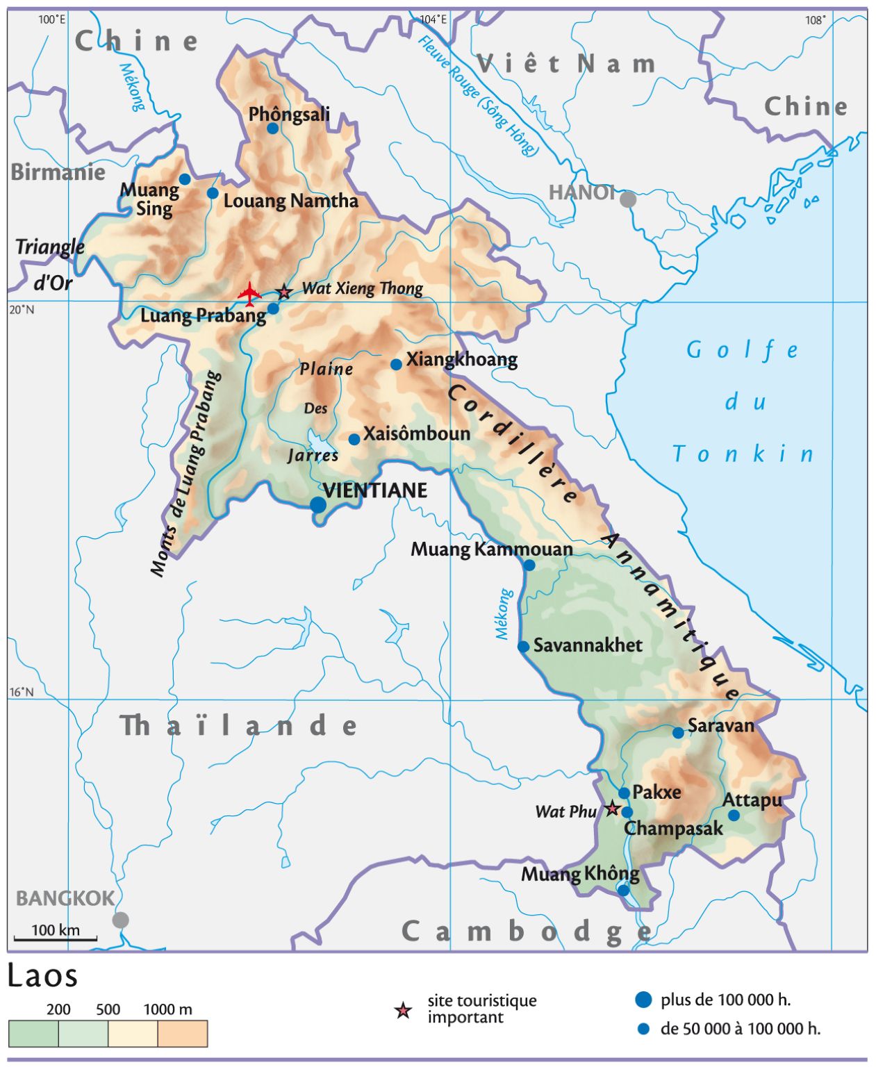 Au S. du tropique du Cancer, arrosé par la mousson d'été, c'est un pays encore enclavé, souvent montagneux, où plus de la moitié du territoire est recouvert par la forêt, parfois défrichée (pratique du ray, culture sur brûlis) ou exploitée (teck). La population, largement rurale, est composée en majeure partie de Lao mais comprend de nombreuses minorités. En partie fondée sur l'exploitation des ressources naturelles (eau, mines, forêt), sur l'expansion des services (dont le tourisme, en hausse) et des investissements chinois, la croissance économique du Laos est l'une des plus fortes de l'Asie du Sud-Est, avec pour principaux partenaires commerciaux la Thaïlande, la Chine et le Viêt Nam.