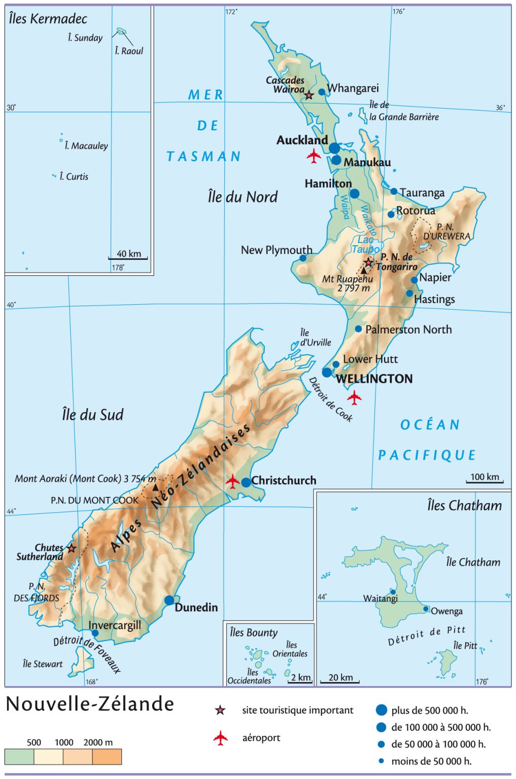 À 2 000 km au S.-E. de l'Australie, dans la zone tempérée de l'hémisphère Sud, ce qui lui vaut un climat à dominante océanique, le pays est formé de deux grandes îles. L'île du Nord concentre 75 % de la population (et les deux principales villes, Auckland et Wellington) sur 42 % de la superficie totale. L'île du Sud a un relief plus contrasté, dominé par les Alpes néo-zélandaises. La population, urbanisée à 86 %, est essentiellement d'origine britannique ; les indigènes (Maoris) en représentent cependant environ 15 %. Le climat, souvent humide surtout au S. et sur la façade occidentale, a favorisé l'extension de la forêt et aussi des terres de parcours (pâturages).