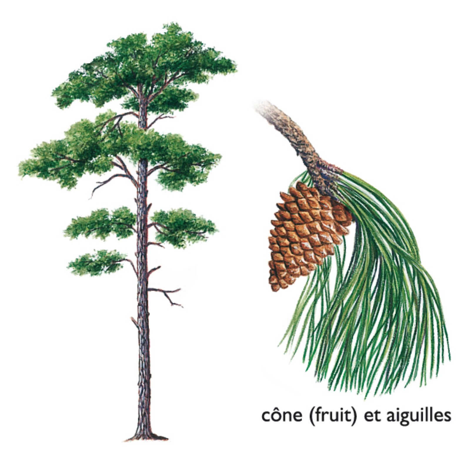 Pin sylvestre, maritime, parasol.Pin d'Autriche.► Famille des pinacées. Le pin peut atteindre 50 m de hauteur ; son fruit (la pomme de pin) est un cône d'écailles lignifiées qui s'entrouvre à maturité pour laisser échapper ses graines.