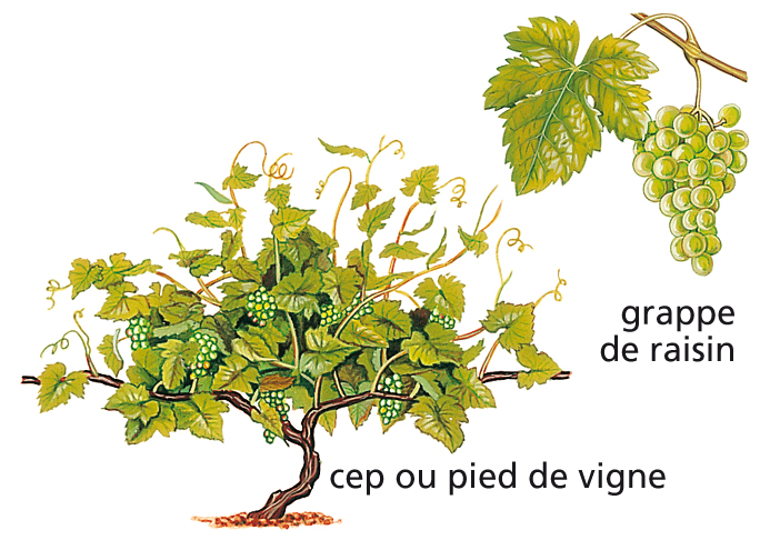 La tige ligneuse de la vigne, ou cep, porte des rameaux feuillés, ou pampres, qui se lignifient ensuite et deviennent des sarments ; les pampres s'accrochent par des vrilles. La vigne produit des raisins, qui servent essentiellement à l'obtention du vin mais qui peuvent aussi être consommés comme fruits frais (raisin de table) ou comme raisins secs.