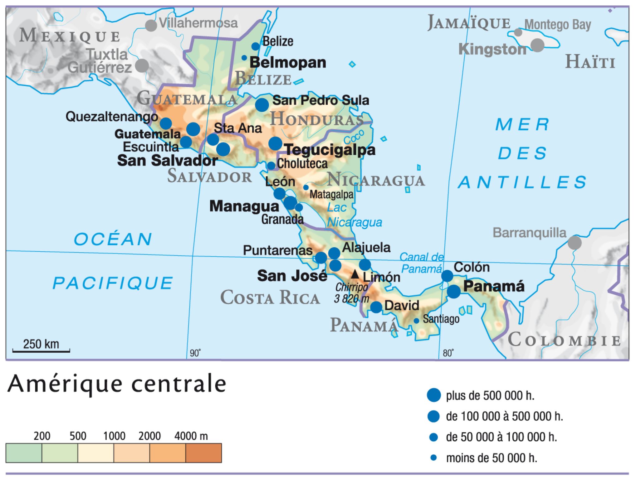Superficie : 42 millions de km2. 972 millions d'habitants. Il s'étend sur plus de 15 000 km du nord au sud, de l'Alaska jusqu'à la Terre de Feu. Il est formé de deux masses triangulaires (Amérique du Nord et Amérique du Sud) reliées par un isthme étroit (Amérique centrale).