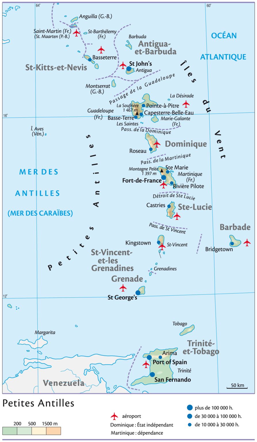 Grandes et Petites Antilles On distingue les Grandes Antilles au nord (Cuba, Haïti, Jamaïque, Porto Rico) et les Petites Antilles au sud et à l'est (Guadeloupe, Martinique, Barbade, Dominique, Trinité, Curaçao). Les Antilles ont majoritairement un relief volcanique et un climat tropical tempéré par un vent assez doux : l'alizé. Les eaux sont bleues et limpides ; on trouve des récifs de corail sur les rivages. Pendant les orages tropicaux, ou ouragans, les vents soufflent à plus de 160 km/h et provoquent d'importants dégâts. Ces îles vivent surtout du tourisme mais on y produit aussi des bananes, des fruits tropicaux et de la canne à sucre.