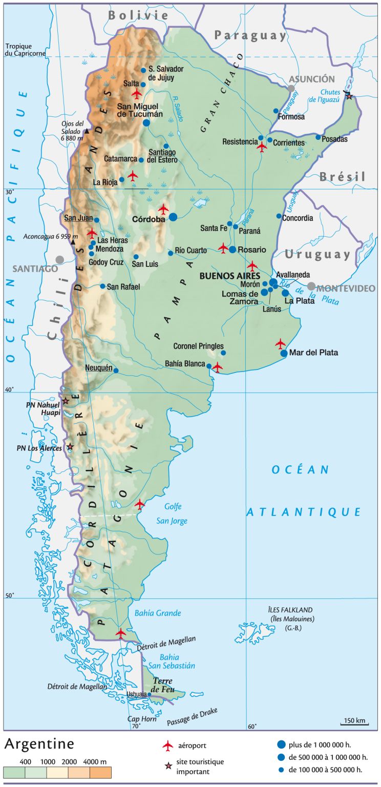 Pays d'Amérique du Sud, sur l'océan Atlantique, la république d'Argentine s'étend du Paraguay à la Terre de Feu (extrémité sud de l'Amérique). Sa partie occidentale, montagneuse, appartient à la cordillère des Andes et comprend le plus haut sommet d'Amérique, l'Aconcagua (point culminant : 6 959 m). Le reste du pays est formé de plaines (Pampa, Chaco) et des plateaux de la Patagonie (au sud). Buenos Aires, sa capitale, regroupe le tiers de la population du pays.