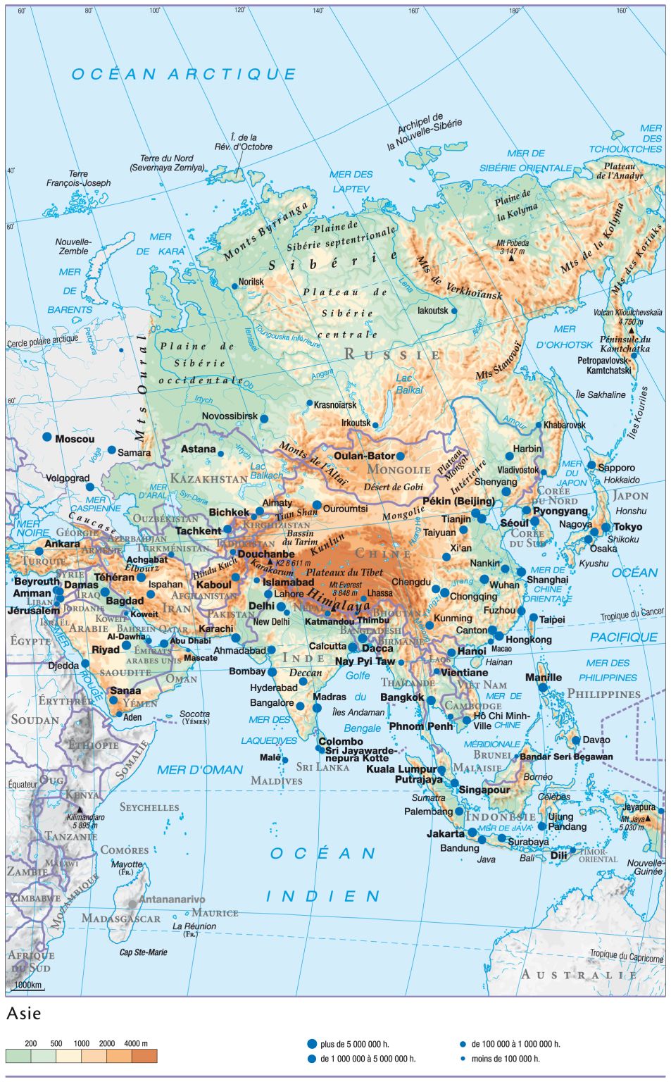 Le continent des contrastes On trouve en Asie à la fois le point le plus élevé du globe, le mont Everest, et le point le plus bas, la mer Morte. L'Asie s'étend de l'Arctique, au nord, jusque sous l'équateur, au sud, et connaît les climats les plus chauds comme les plus froids, les plus secs comme les plus humides. Certaines régions d'Asie (la Chine orientale, l'Asie du Sud-Est) sont extrêmement peuplées alors que d'autres (la Sibérie, le Tibet, le désert de Gobi, l'Himalaya) sont pratiquement inhabitées.