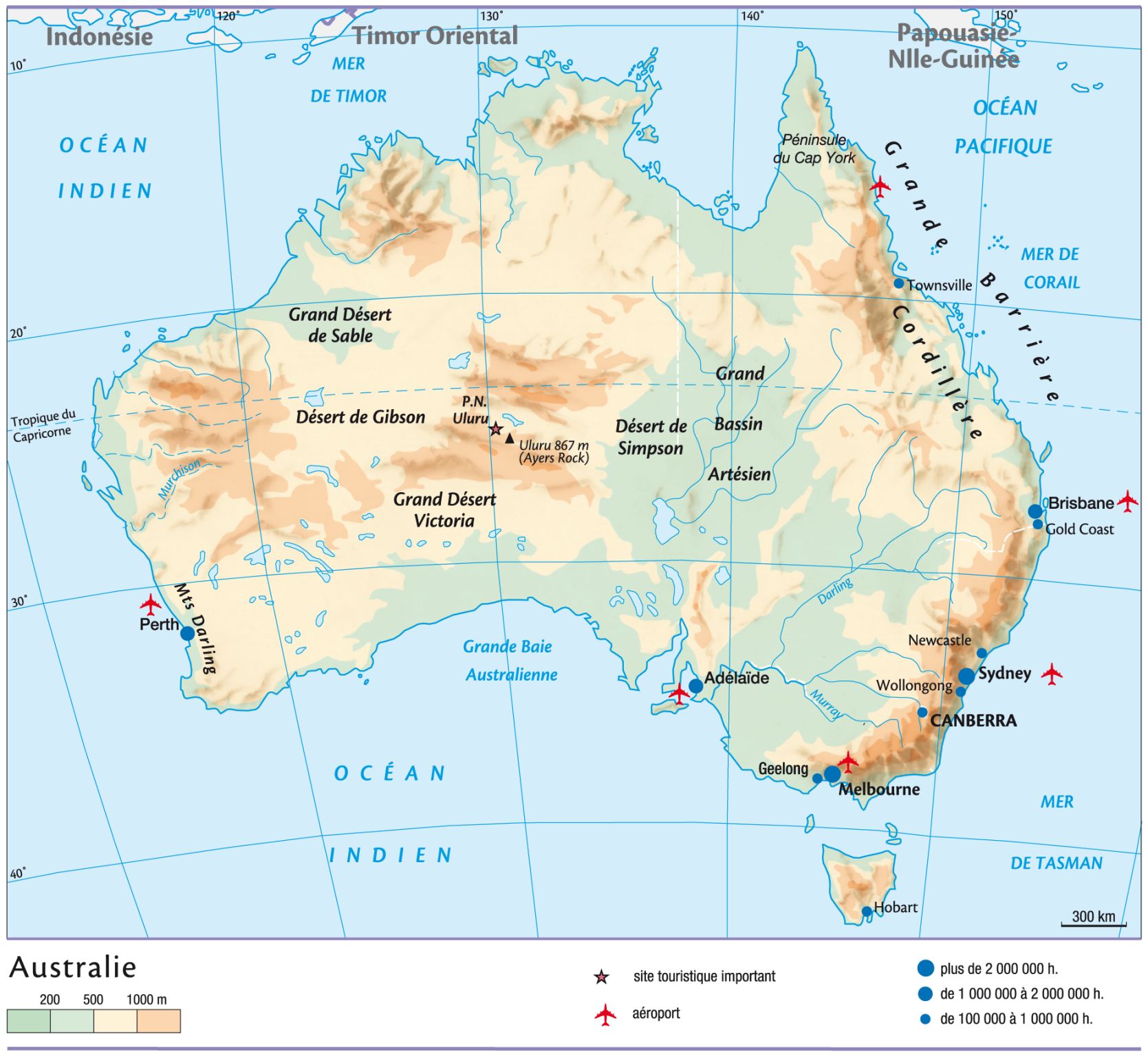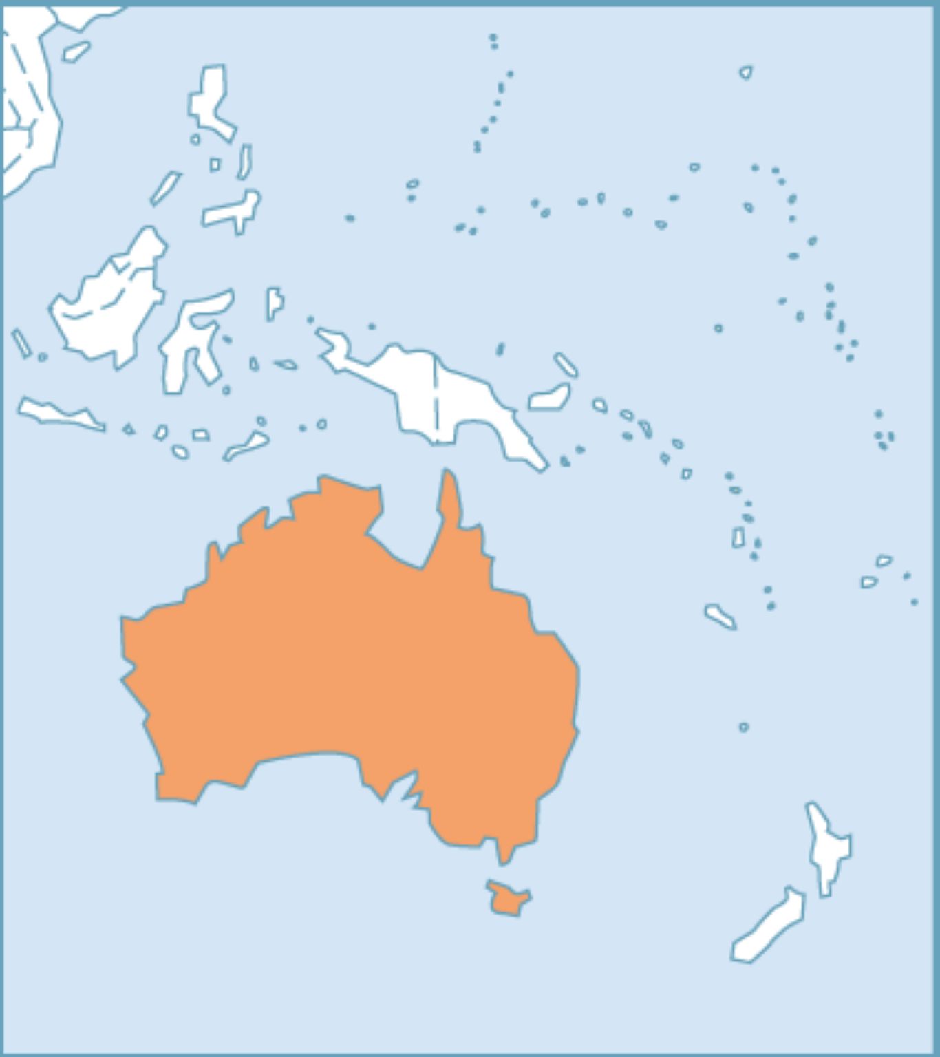 Très grande île d'Océanie, peuplée en majorité par des immigrants d'origine européenne, l'Australie constitue à elle seule un véritable continent. C'est un pays désertique en dehors des côtes est et sud, où se concentre la majorité des villes. Les Aborigènes, premiers habitants de l'Australie, représentent environ 3 % de la population.