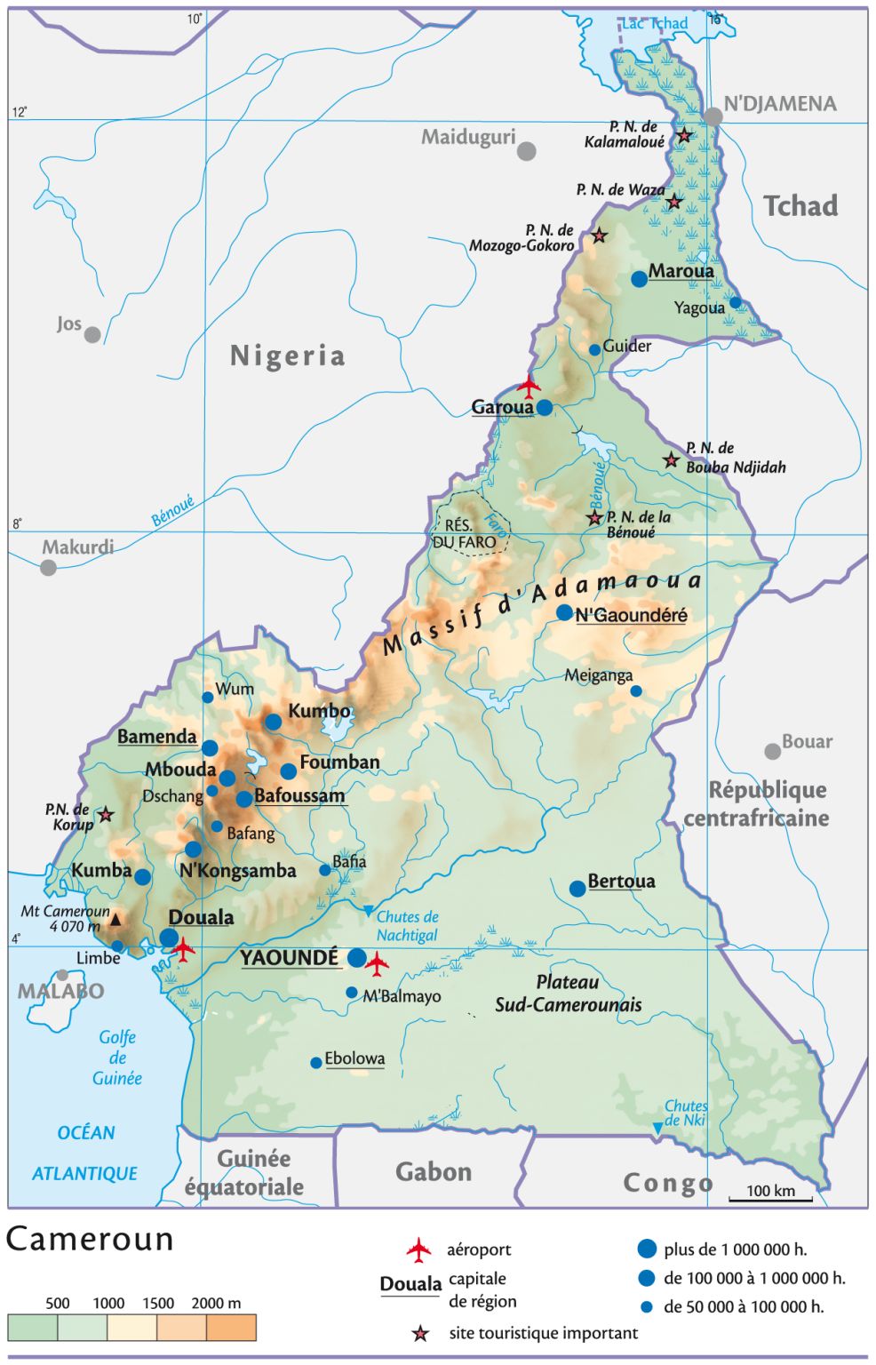 Situé sur le golfe de Guinée, le Cameroun est formé de plaines le long des côtes, de quelques hauteurs volcaniques (le mont Cameroun culmine à 4 070 m) et de chaînes massives au centre. République indépendante depuis 1960, le pays exporte du bois précieux, du cacao et du café. Il produit aussi de l'aluminium et du pétrole.