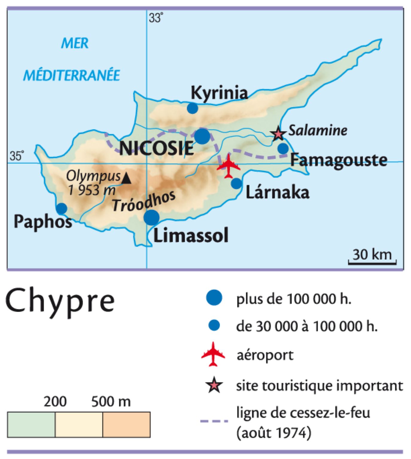 Île de la mer Méditerranée, entre la Grèce et l'Asie, Chypre est peuplée par des Grecs et des Turcs, qui s'opposent fréquemment. Depuis 1974, l'île est partagée en deux : une partie turque au nord, une partie grecque au sud. La partie grecque a rejoint l'Union européenne en 2004.