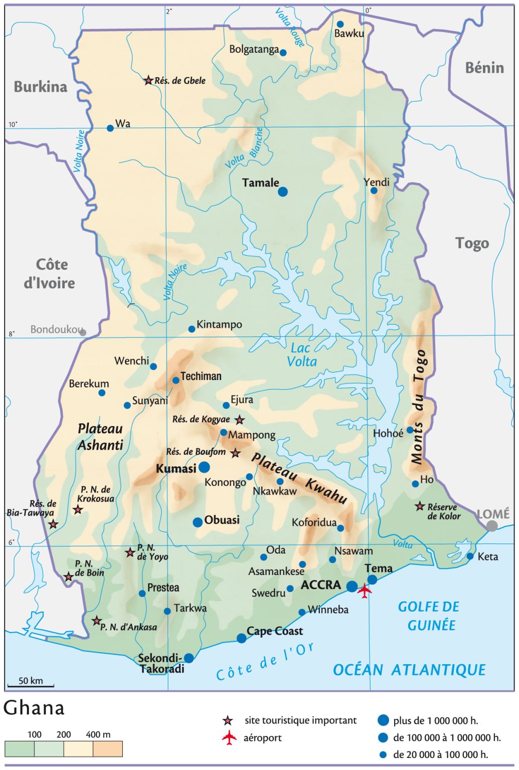 Situé à l'ouest de l'Afrique, sur le golfe de Guinée, le Ghana est un pays de forêts denses parsemées de plantations au sud et de savanes au nord. Il connaît une expansion économique grâce à ses exportations d'or, de pétrole, de cacao et de bois. Ancien territoire britannique, le Ghana est le premier pays d'Afrique subsaharienne à devenir indépendant en 1957.