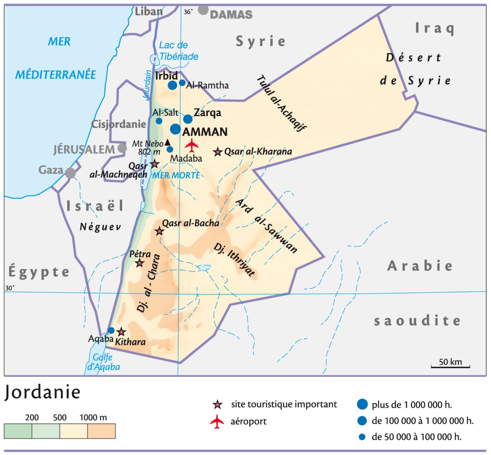 Le royaume de Jordanie, situé à l'est d'Israël, est en grande partie désertique, même si l'agriculture est possible autour du fleuve Jourdain. Il possède des sites antiques remarquables (dont Pétra) visités par de nombreux touristes. Depuis 2011, le pays accueille de très nombreux réfugiés syriens ayant fui la guerre dans leur pays.