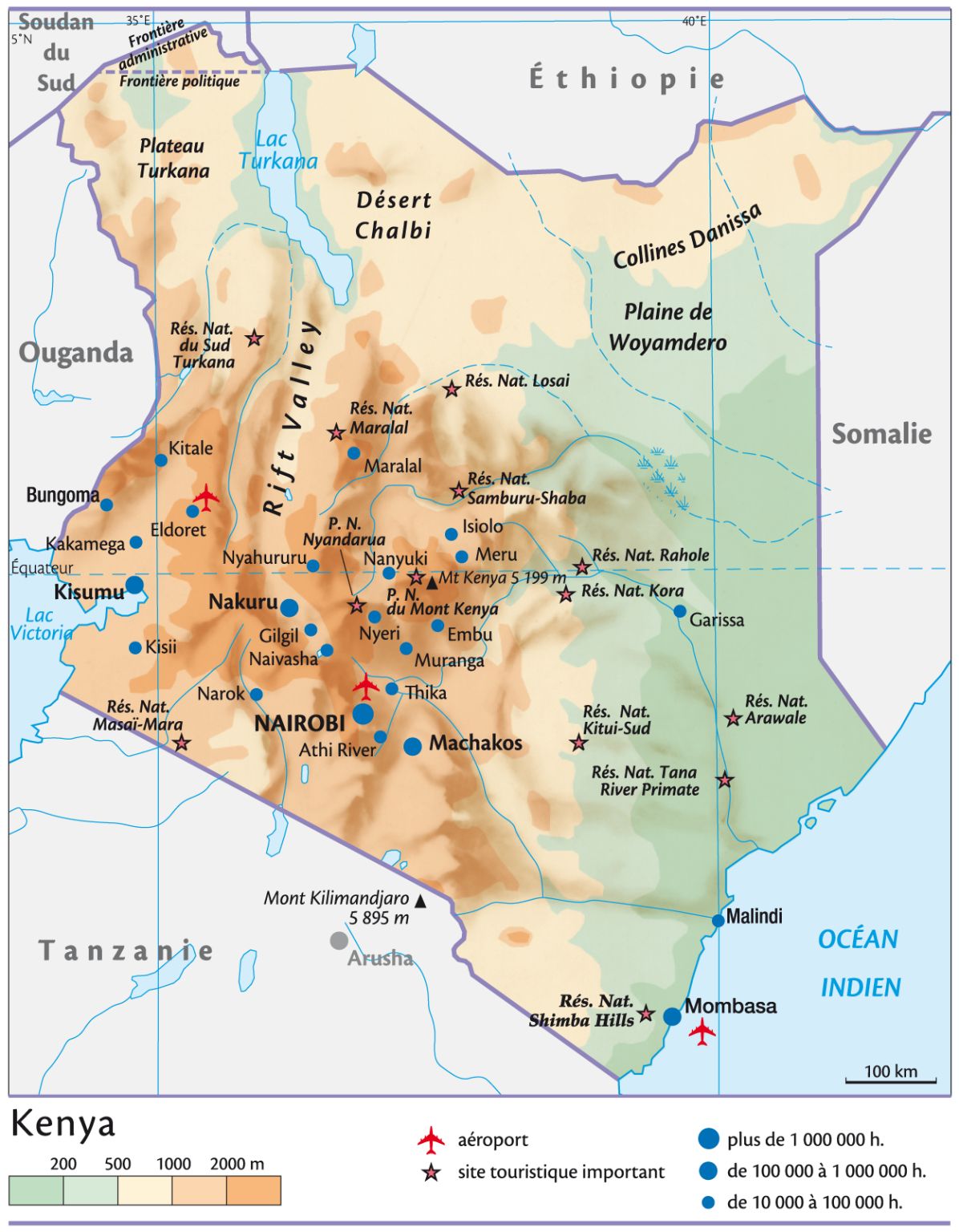 Situé en Afrique orientale, le Kenya est indépendant depuis 1963. À l'ouest, montagneux et volcanique (point culminant : 5 199 m au mont Kenya), est concentrée une grande partie de la population. Le pays a créé très tôt d'importantes réserves d'animaux sauvages où fauves, antilopes et autres représentants de la faune africaine vivent en liberté. Ces parcs attirent les touristes. L'autre ressource du pays est l'agriculture (exportations de café, de thé et de produits de l'horticulture).