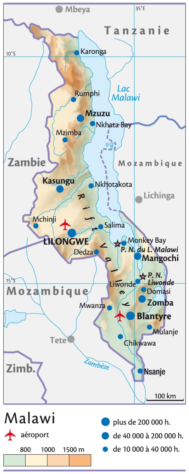 Le Malawi s'étend sur la rive ouest du lac Malawi que l'explorateur britannique Livingstone découvrit en 1859. Le pays est devenu indépendant en 1964. Formé de hauts plateaux, il jouit d'un climat agréable grâce à l'altitude et vit de l'agriculture (thé, canne à sucre, tabac).