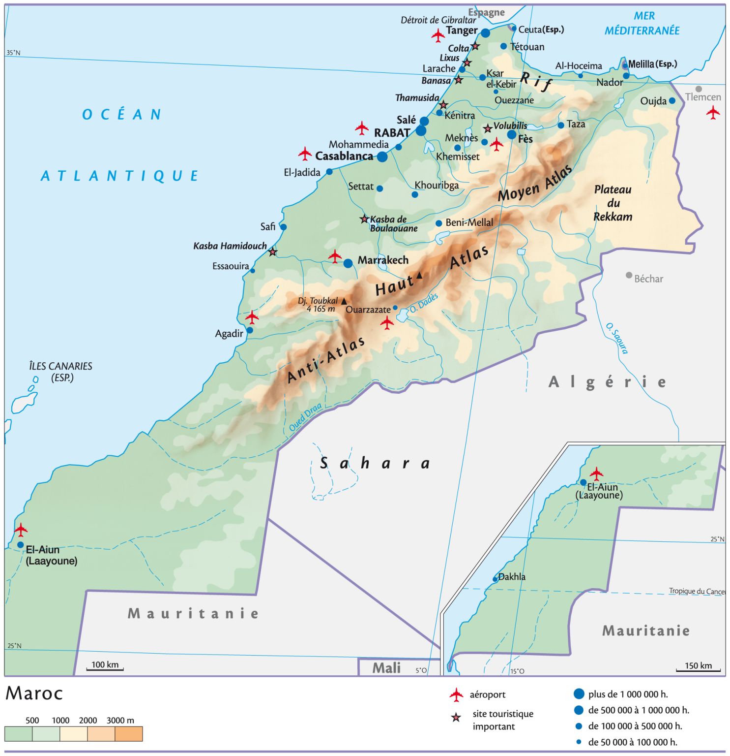Pays situé au nord-ouest de l'Afrique, sur l'océan Atlantique et la mer Méditerranée, le Maroc offre des paysages variés : le littoral atlantique, formé de plaines et de plateaux, est séparé du plateau oriental par la chaîne de l'Atlas ; le nord est occupé par la chaîne du Rif et le sud appartient à la partie ouest du Sahara. Après avoir été sous la dépendance de la France, le pays est devenu indépendant en 1956. Le royaume du Maroc dispose de ressources agricoles, minières et touristiques.