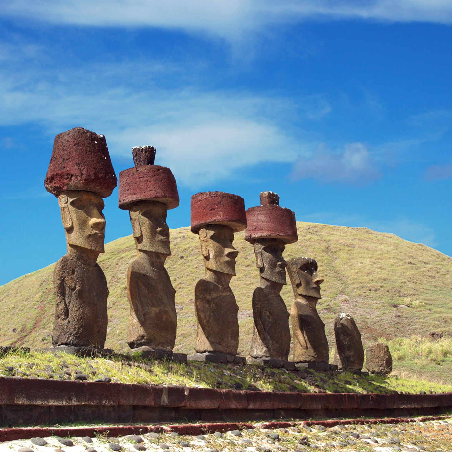162 km2 ; 3 790 habitants. L'île de Pâques, d'origine volcanique, est située à l'ouest du Chili, dont elle dépend. Le peuple polynésien l'habita sans le moindre contact avec d'autres civilisations jusqu'à sa découverte par les Européens en 1722 ; il y érigea des statues monolithiques géantes.