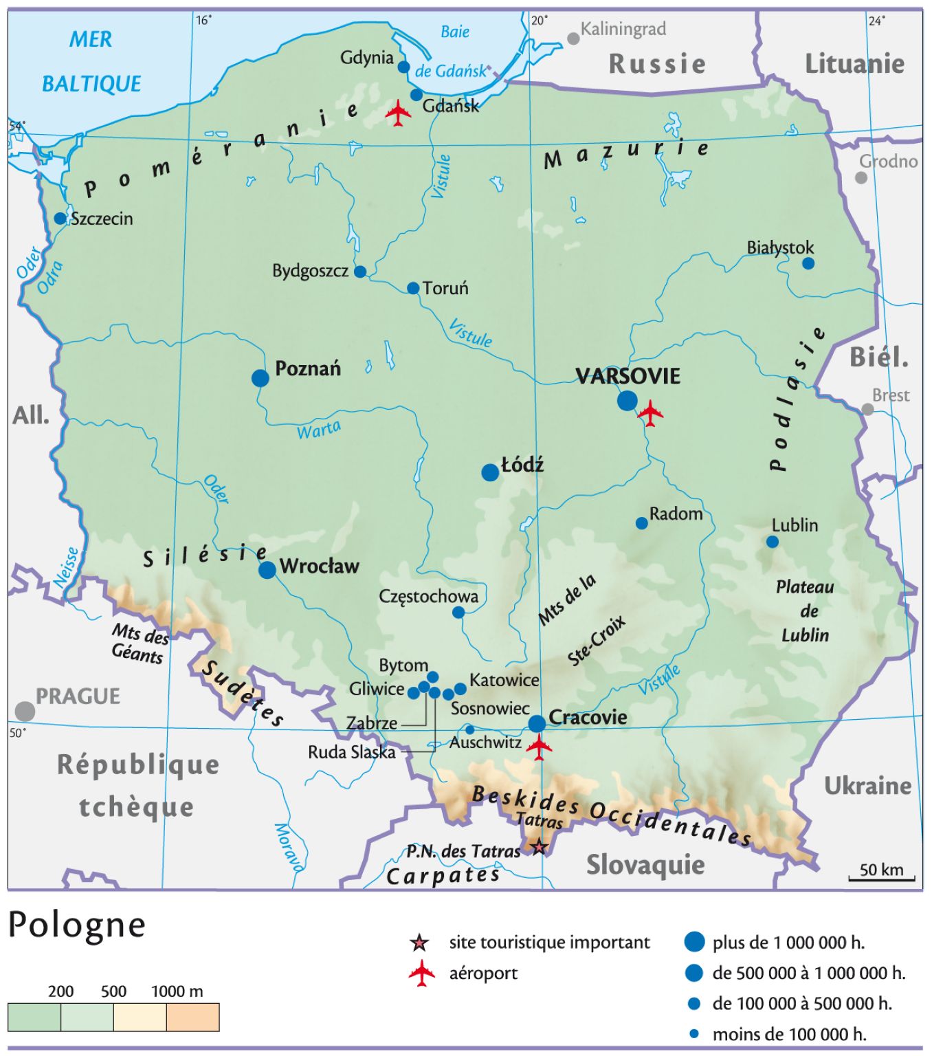 Pays de l'Europe centrale, sur la mer Baltique, la Pologne, dont les frontières ont été souvent modifiées au cours de l'histoire, a été dévastée pendant la Seconde Guerre mondiale. Ses ressources sont agricoles (céréales, pomme de terre, betterave à sucre, élevage) et industrielles (sidérurgie). Le pays a aussi des ressources énergétiques et minières (charbon, gaz naturel), et a connu l'une des plus fortes croissances parmi les pays de l'Union européenne, dont il est membre depuis 2004.