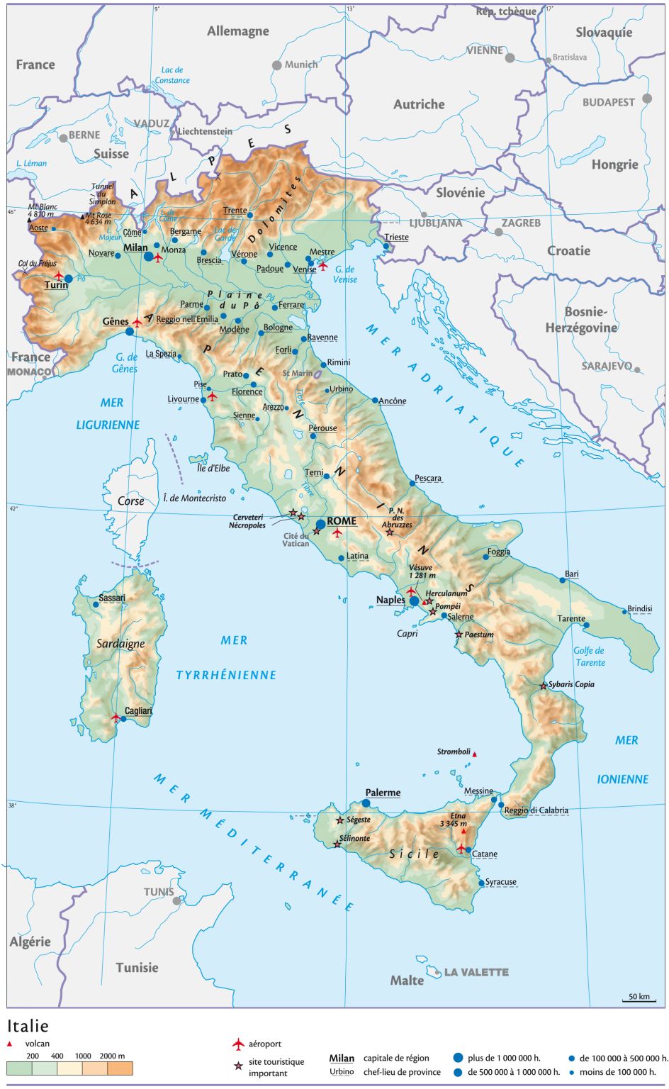 25 700 km2. Environ 5 millions d'habitants (les Siciliens). Capitale : Palerme. La Sicile est une île montagneuse de la Méditerranée. Elle possède un grand volcan toujours en activité : l'Etna. Les coteaux de l'île sont recouverts d'oliviers, d'orangers et de vignobles. La Sicile fut colonisée dès l'Antiquité ; on peut y admirer de splendides vestiges grecs et romains. Du Moyen Âge au XIXe siècle, l'île subit diverses invasions, puis passa sous le pouvoir de différents royaumes d'Europe. Ce n'est qu'en 1860 qu'elle fut incorporée à l'Italie. Depuis la Seconde Guerre mondiale, l'île souffre d'un grand retard économique et de la terreur semée par la Mafia, organisation criminelle clandestine.