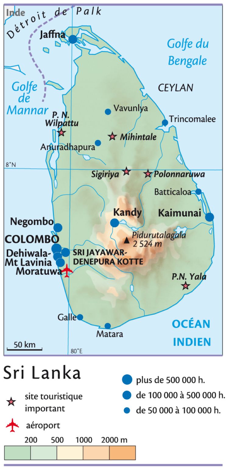 Île de l'Asie méridionale, au sud-est de l'Inde, le Sri Lanka, qui s'est appelé Ceylan jusqu'en 1972, est indépendant depuis 1948. Le thé et le riz sont les principales ressources du pays, dont l'économie a été déstabilisée par plusieurs années de guerre civile entre l'État et la minorité tamoule. Depuis la fin de ce conflit (2009), le pays a retrouvé la croissance, et le tourisme a fortement augmenté.