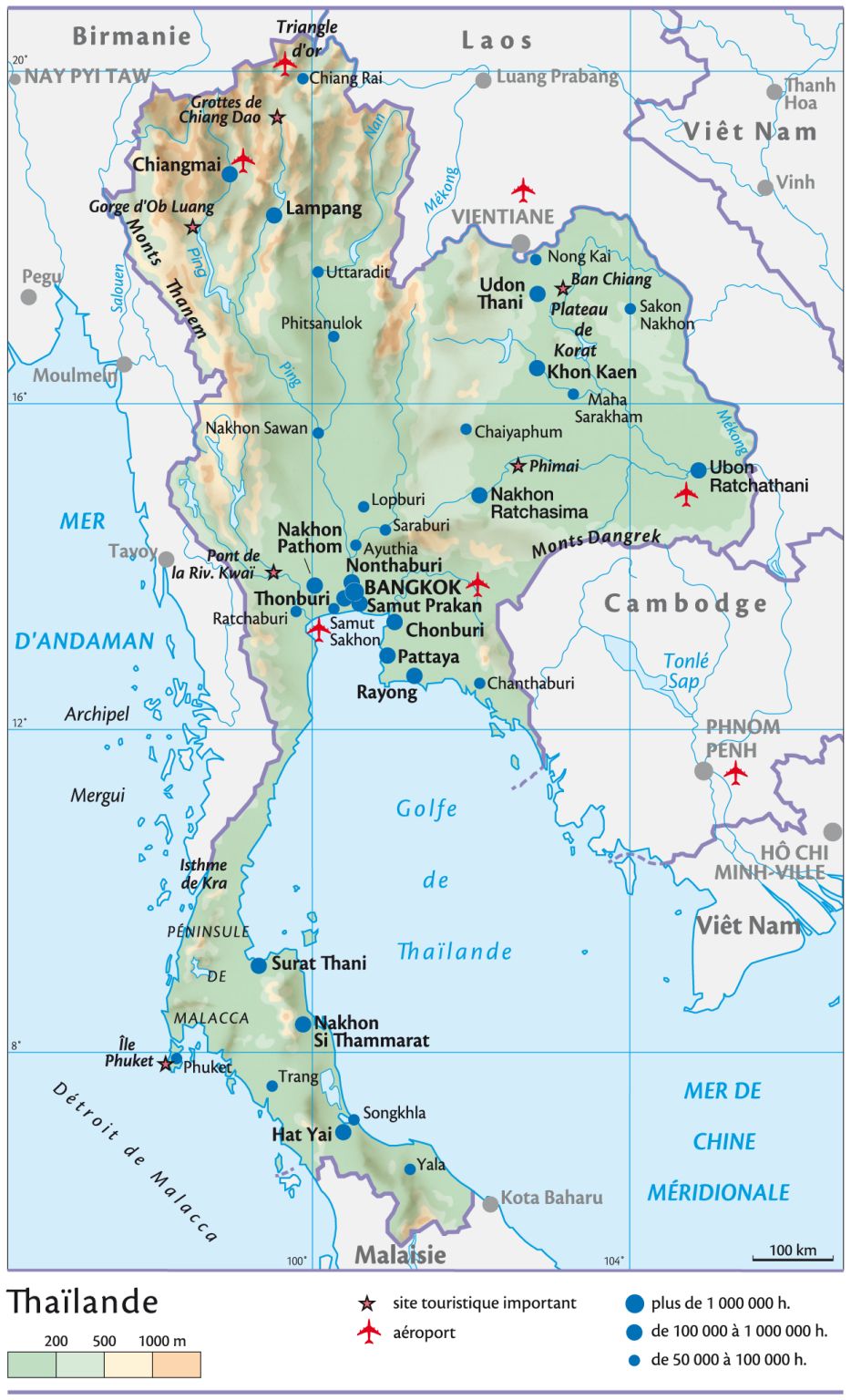Situé en Asie du Sud-Est, entre la Birmanie, le Laos et le Cambodge, le royaume de Thaïlande vit en partie de l'agriculture (riz) et de la pêche. Le nord et l'ouest du pays, montagneux, fournissent, entre autres, du bois de teck, et le sud (péninsule de Malacca) dispose de plantations d'hévéas. Tragiquement atteint par le tsunami (raz de marée d'origine sismique) de décembre 2004, le tourisme demeure une ressource très importante.