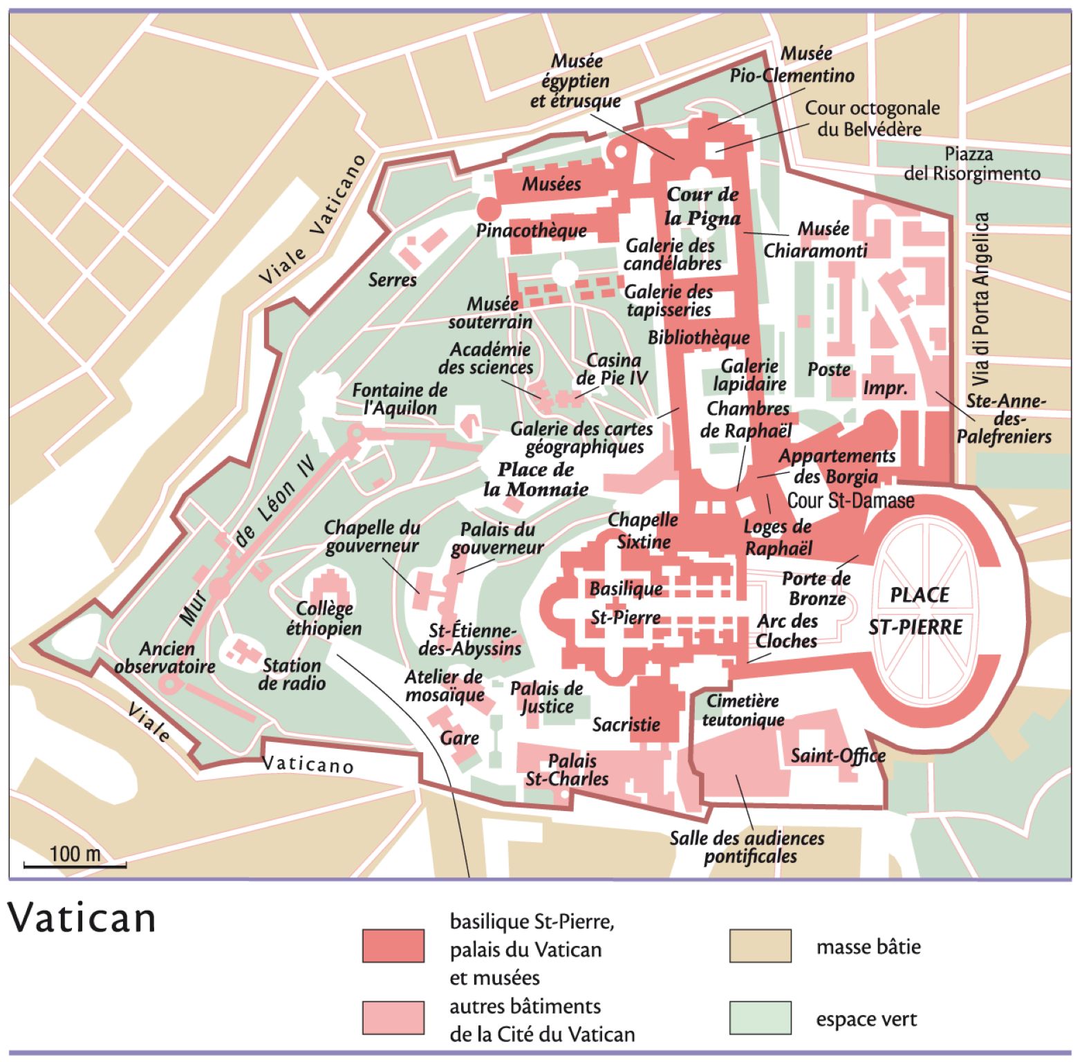 Le Vatican se trouve à l'intérieur de la ville de Rome en Italie. D'une superficie de 0,4 km2 , c'est le plus petit État du monde. Il se compose, pour l'essentiel, de la place et de la basilique Saint-Pierre, de jardins et du palais du Vatican, qui abrite notamment la chapelle Sixtine. Le Vatican dispose aussi d'un journal, d'une station de radio et d'un centre de télévision.