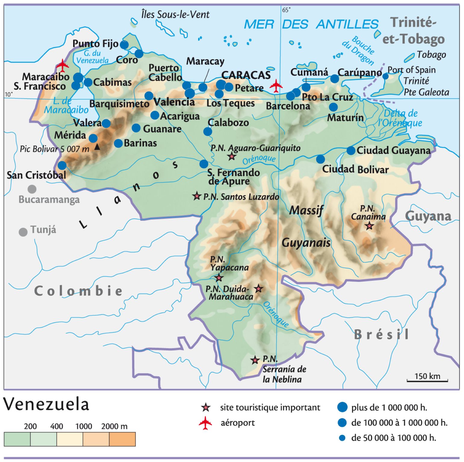 La république du Venezuela se situe en Amérique du Sud, au nord-ouest du Brésil, sur la mer des Antilles. La population se concentre sur la côte. L'économie du pays, très instable (hyperinflation), repose en grande partie sur l'exploitation du pétrole, dont le pays détient les premières réserves dans le monde, devant l'Arabie saoudite.