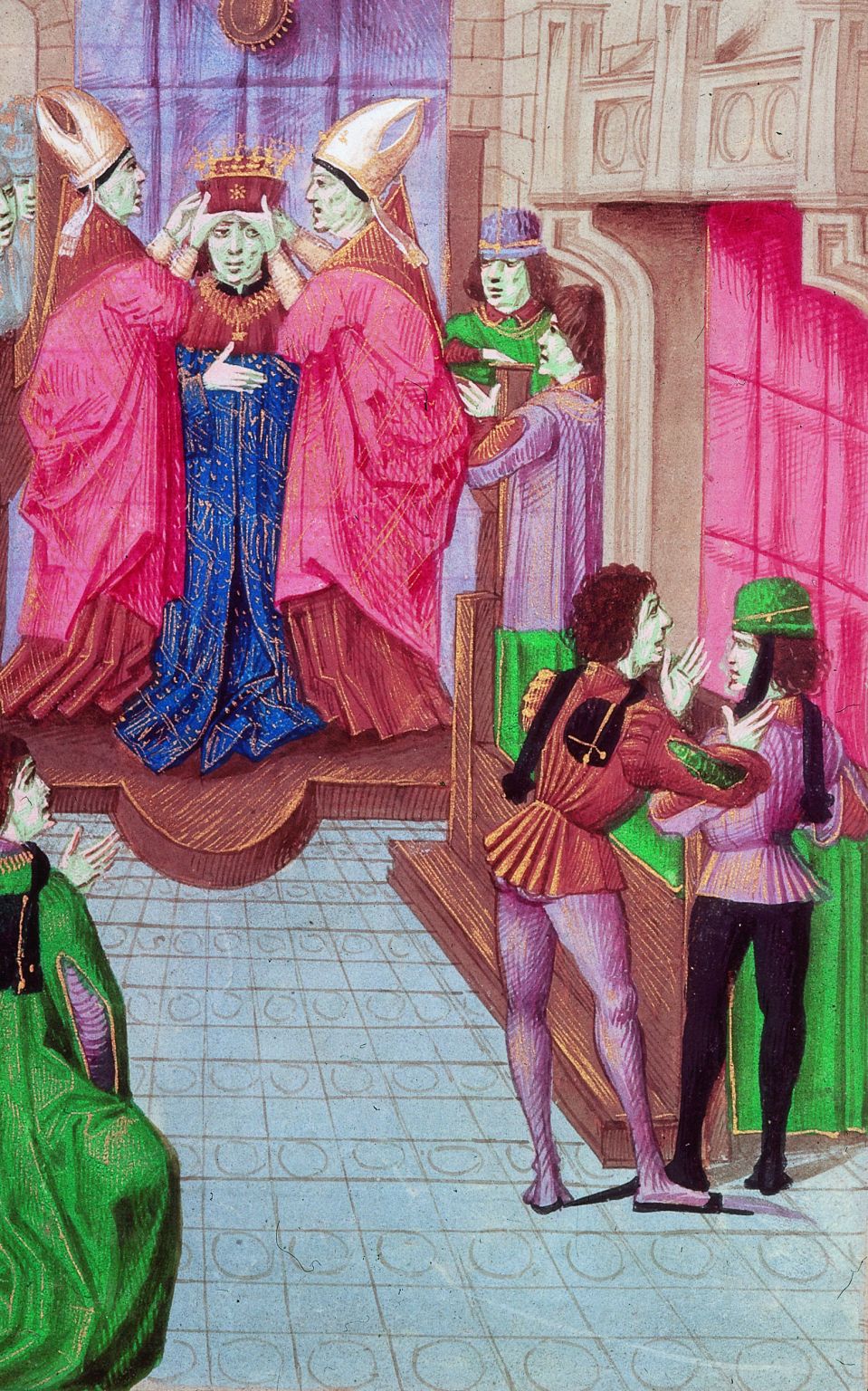 Cérémonie au cours de laquelle un empereur ou un roi est couronné. Le couronnement de Charlemagne.