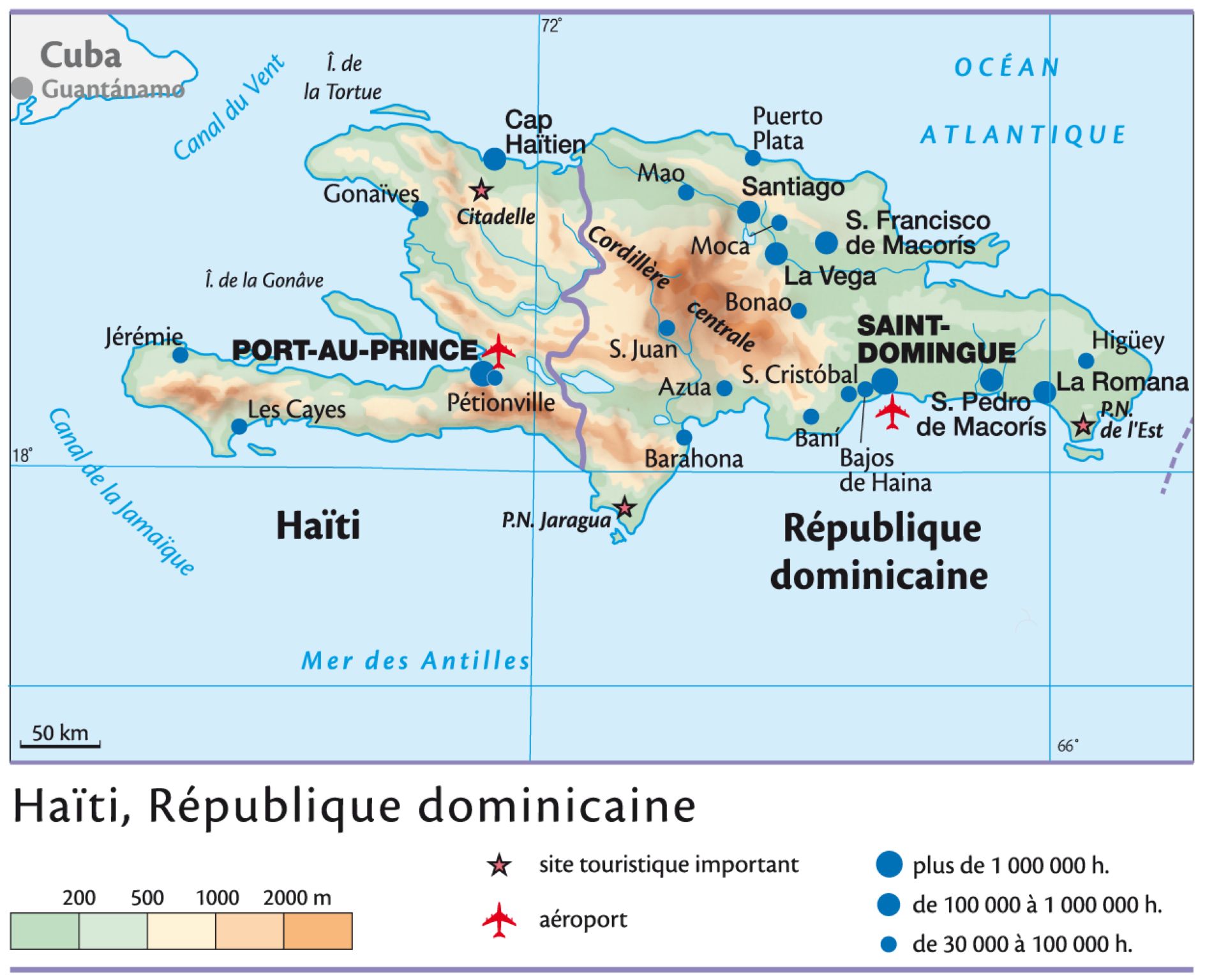 La République dominicaine se situe sur l'île d'Haïti, aux Antilles. Son territoire représente environ les deux tiers de l'île. Elle tire ses principales ressources de l'agriculture : sucre de canne, riz, café, cacao et tabac.