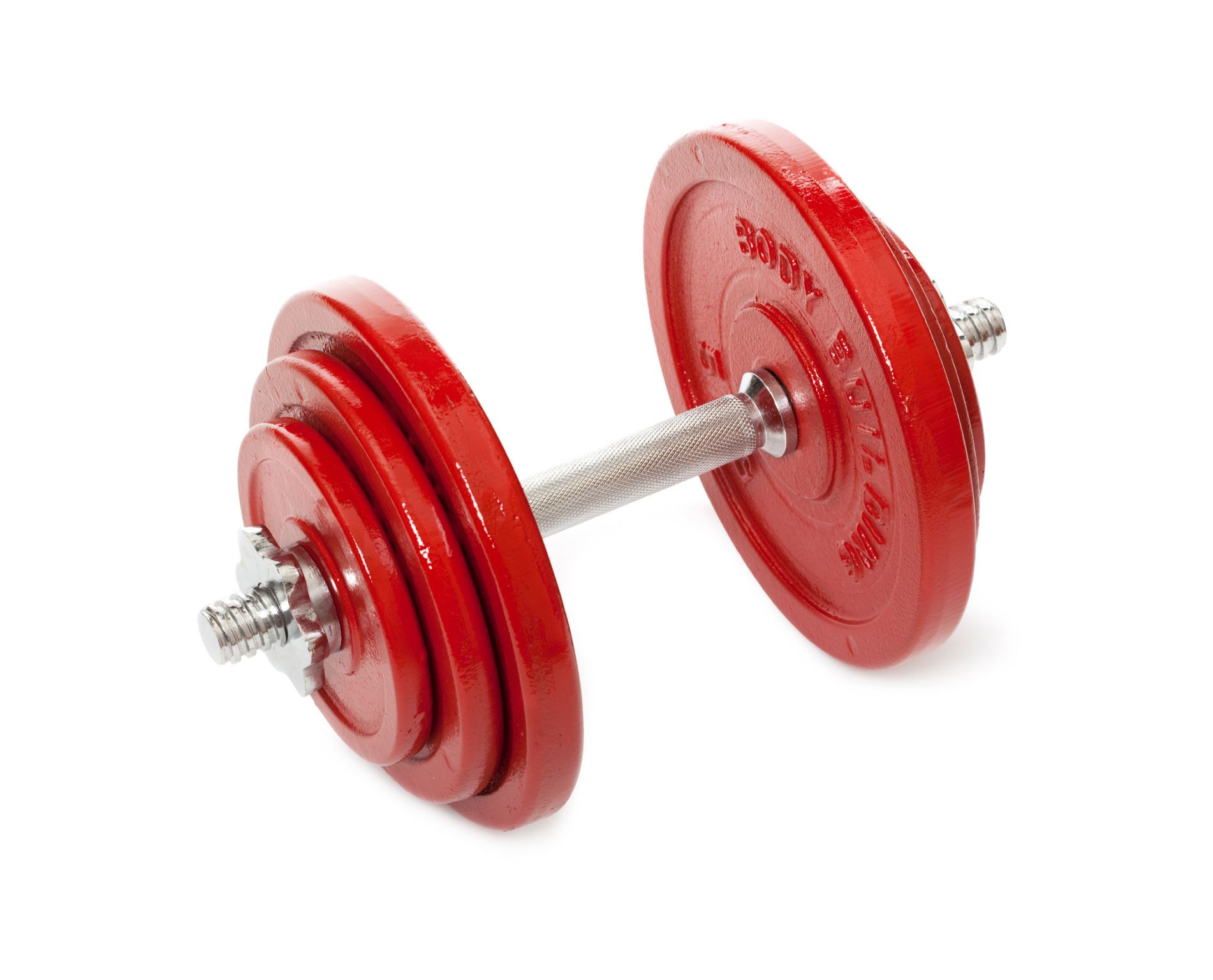 Instrument de musculation fait de deux boules ou de deux disques de métal réunis par une barre. Soulever des haltères.