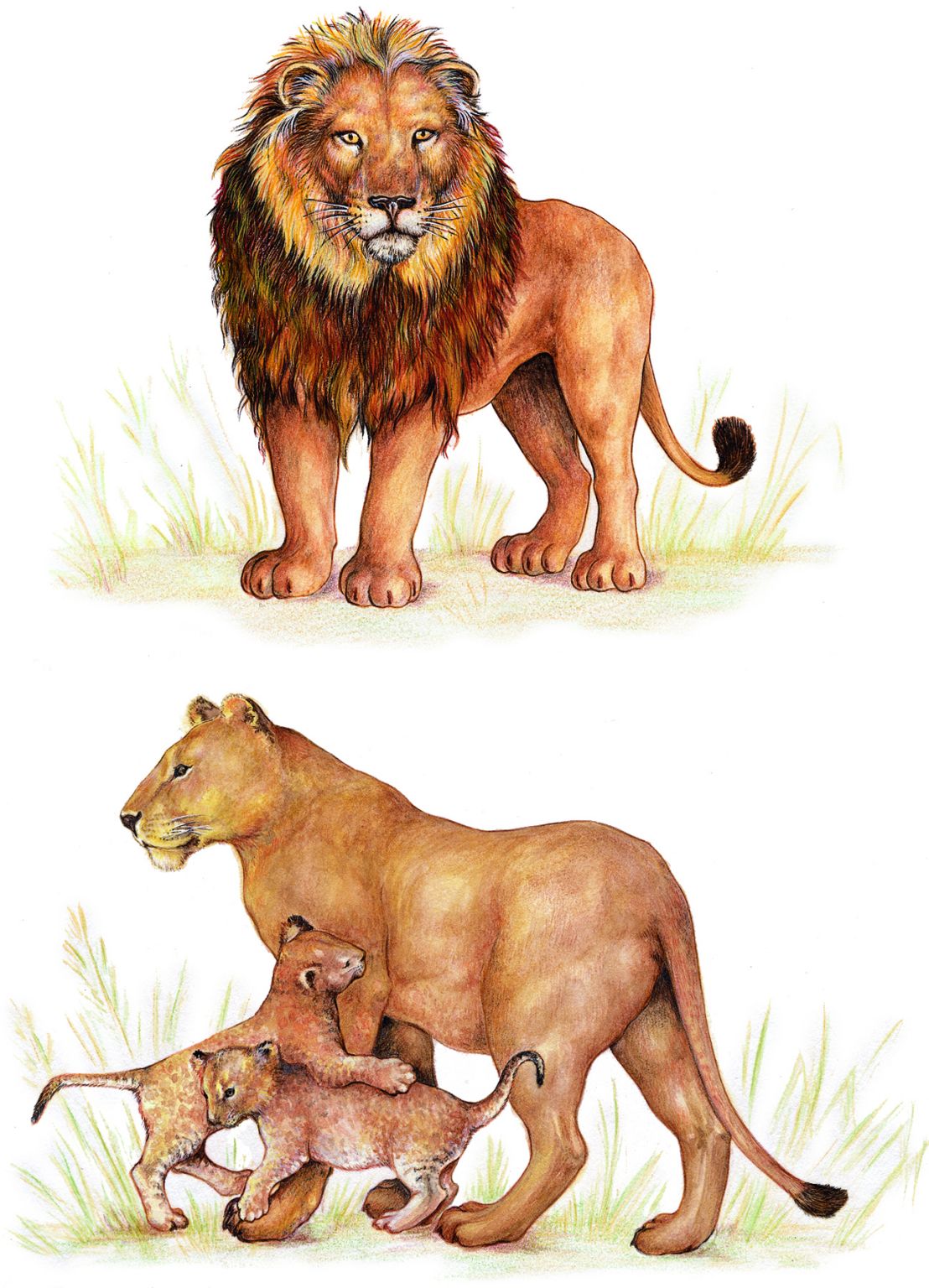 Femelle : la lionne. Petit : le lionceau. Cri : le rugissement. Le lion est un félin.