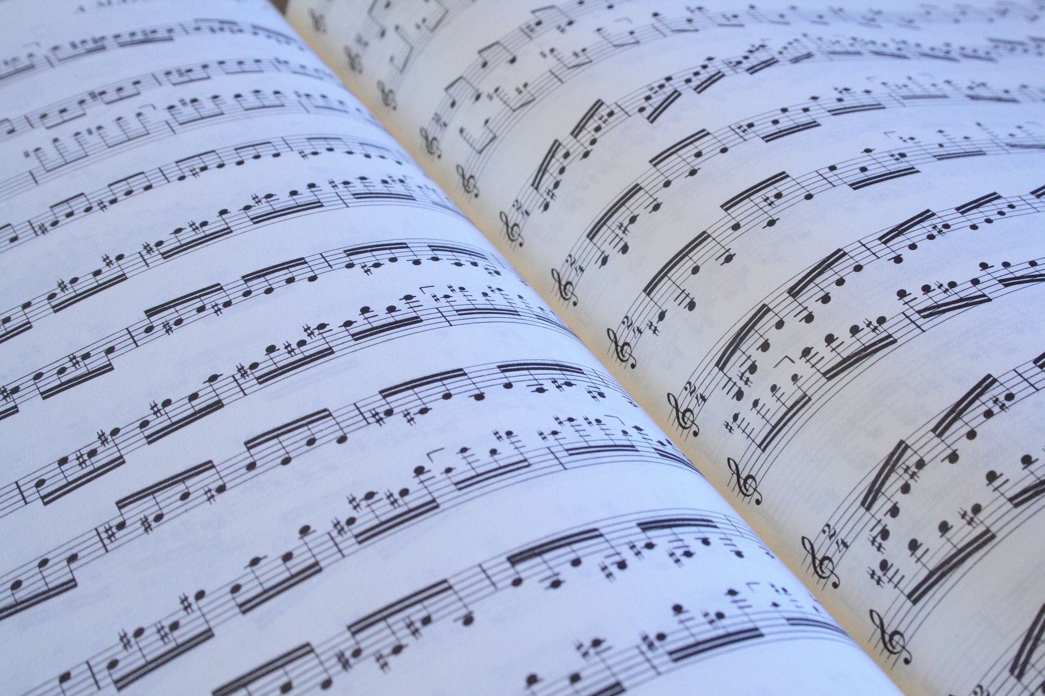 Feuille où sont inscrites les notes d'un morceau de musique. Baptiste sait lire une partition.