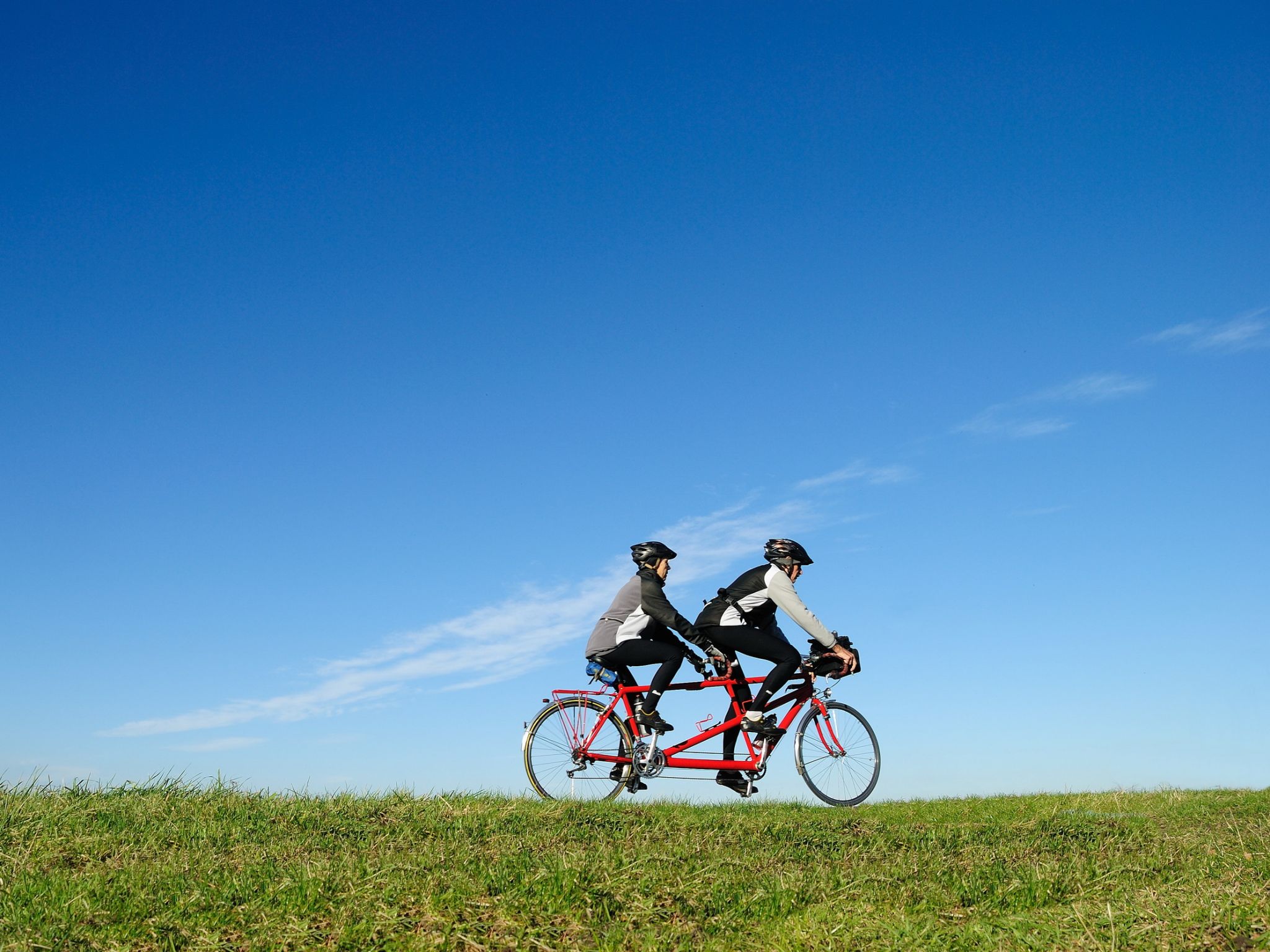 Bicyclette conçue pour deux personnes qui pédalent l'une derrière l'autre.