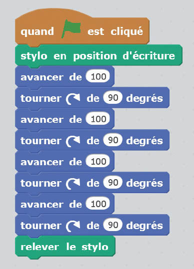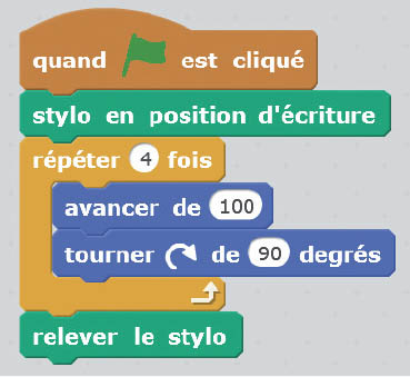On remarque que l’on répète 4 fois les instructions suivantes : avancer de 100, tourner de 90 degrés.