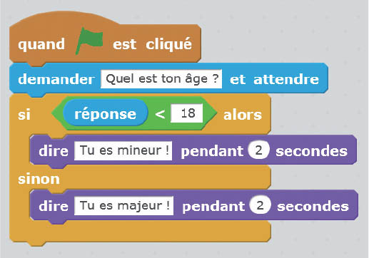 On peut aussi faire en sorte d’appliquer des instructions seulement dans certains cas, en limitant leur exécution par une condition : c’est l’utilisation de la fonction « Si… alors… (Sinon) ». Voici un exemple où l’on demande l’âge de l’utilisateur. Le programme répond en regardant si l’âge est inférieur ou non à 18 ; si c’est le cas, il répond « Tu es mineur ! », sinon il répond « Tu es majeur ! ».
