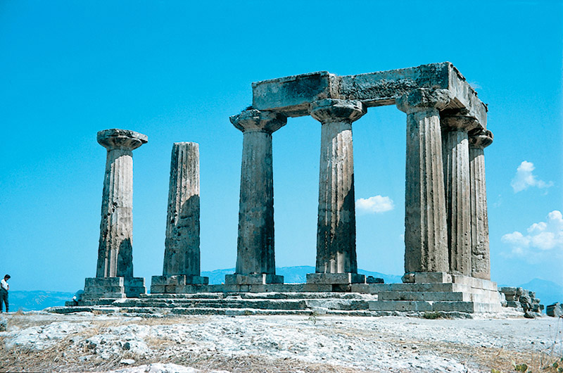 Vestiges du temple d’Apollon à Corinthe, l’un des premiers temples doriques en Grèce continentale (550-525 av. J-C.).