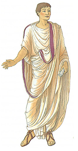 Toge romaine. En forme de segment de cercle, elle est ornée d’une bande de pourpre sur le bord.