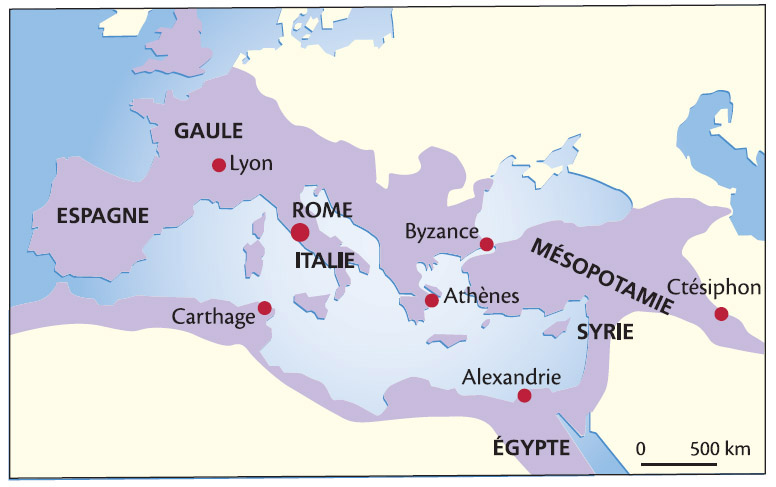 En 27 av. J.-C., l’héritier de César, Octave, devient le premier empereur sous le nom d’Auguste. Durant cinq siècles, les habitants de l’Empire romain sont tenus de célébrer le culte impérial. Les provinces sont administrées par des sénateurs ou par des chefs militaires. La « paix romaine » va permettre, grâce à la construction de voies, d’aqueducs, de thermes et de théâtres, l’essor de la civilisation urbaine et celui du commerce. La culture gréco-romaine est diffusée dans tout l’empire par la langue latine, écrite et parlée.