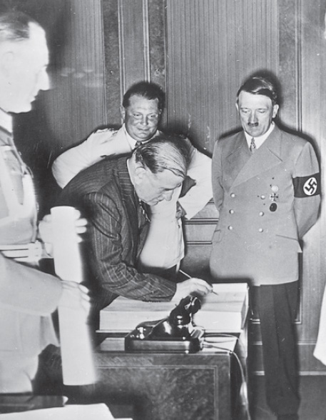 Édouard Daladier, président du Conseil français, signant les accords de Munich le 30 septembre 1938 devant Hermann Göring (à g.) et Hitler (à d.).