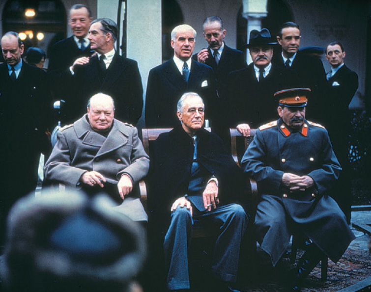 La conférence de Yalta (février 1945). De gauche à droite : W. Churchill, F.D. Roosevelt et Staline.