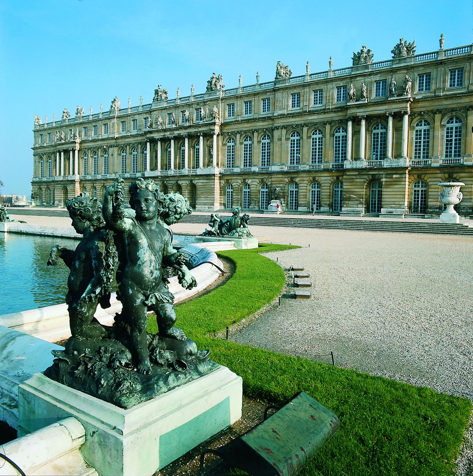 Façade du château de Versailles: commencé en 1662 par Louis Le Vau, continué à partir de 1678 par Hardouin-Mansart, le palais consacre le classicisme français et fournit un modèle de magnificence princière que l’Europe imitera.