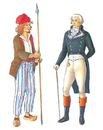 Un sans-culotte vers 1792. Il porte la carmagnole (veste courte), le pantalon de matelot et le bonnet révolutionnaire. À droite, costume de la fin du XVIIIe s.